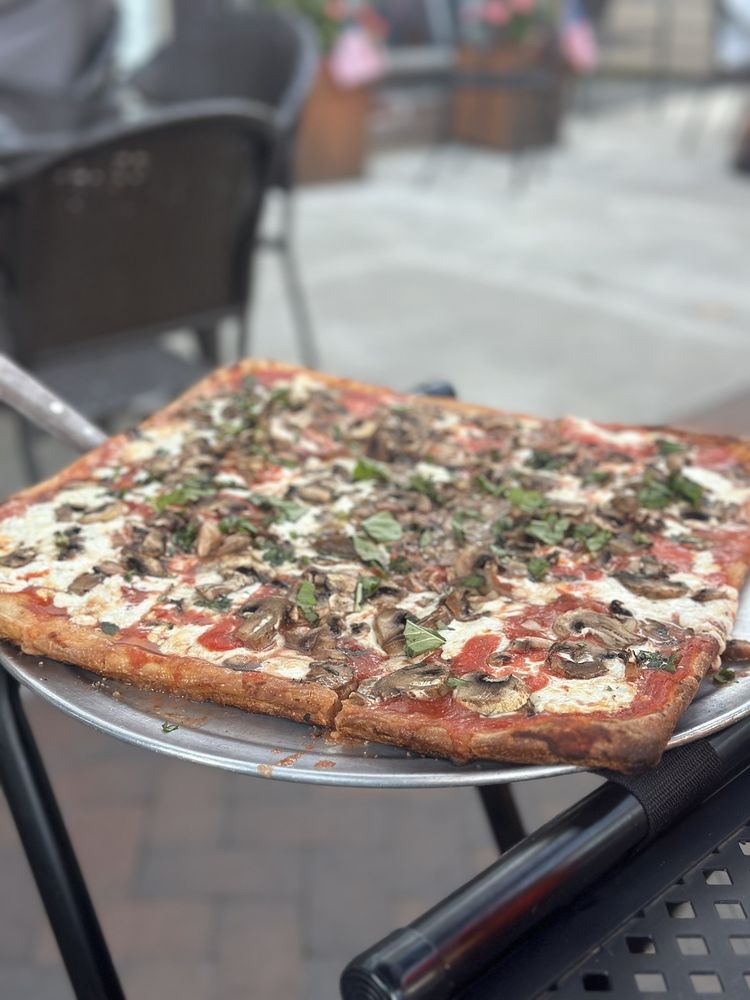 Square thin crust, fresh mozzarella, imported plum tomatoes, extra virgin olive oil, basil.